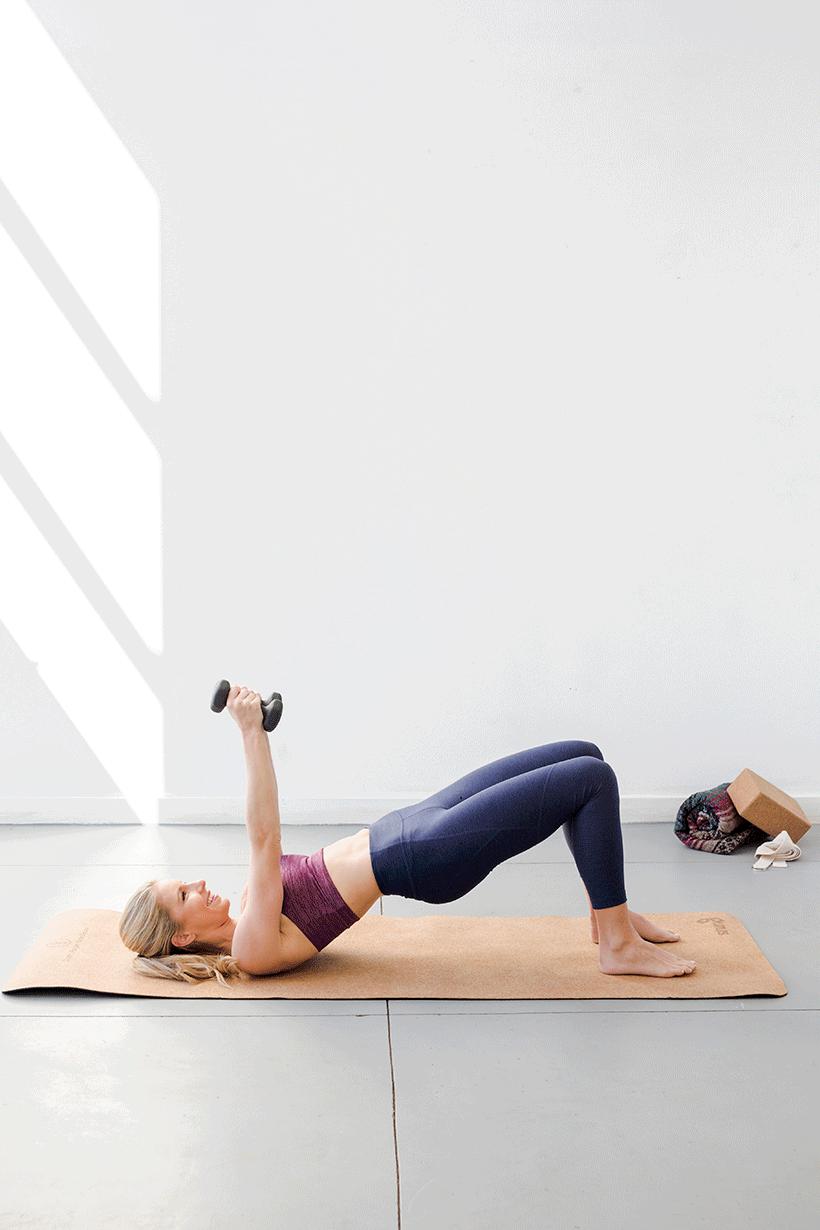 В позе «полумост» (упор на плечи, спина не провисает, колени согнуты) делайте 20 отжиманий над головой.