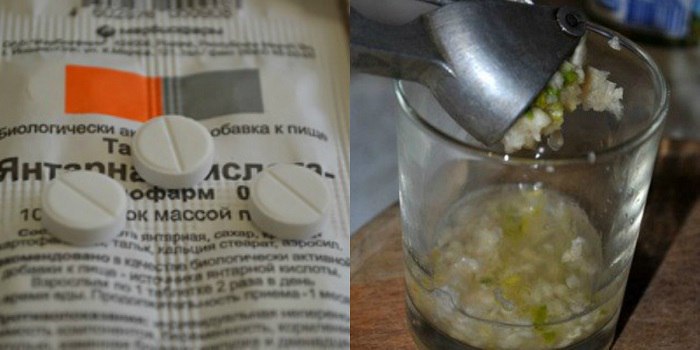 Готовится очень просто. Растворяем янтарную кислоту в горячей воде. Выдавливаем туда же чесночный сок. И в стеклянной емкости даем настояться сутки.