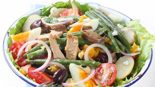 5. Выложить в миску фасоль, маслины, тунец, помидоры, залить заправкой, посолить и поперчить, перемешать. Разложить по тарелкам, сверху выложить яйцо и петрушку.
