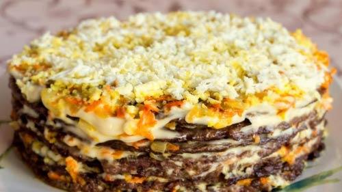 лук мелко порезать, морковку натереть на терке, выложить на сухую сковороду, плеснуть чуть водички, посолить и потушить до мягкости на среднем, потом на медленном огне. Дать немного остыть, добавить мелко порубленный чеснок, укроп и натуральный йогурт, досолить по вкусу. Промазывать коржи и сложить в виде тортика, сверху украсить укропом или луком. Очень вкусно) приятного аппетита.