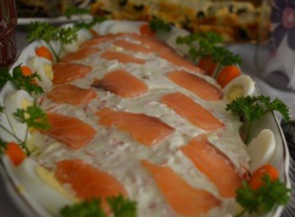Украшаем красной рыбой, нарезанной соломкой.