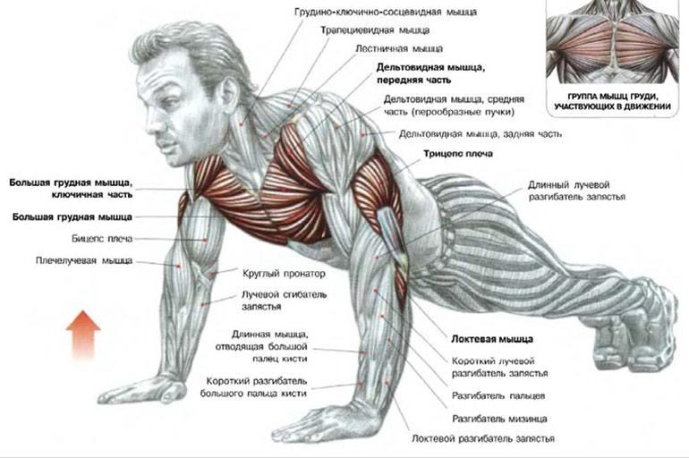 Основную нагрузку воспринимают грудные мышцы и трицепсы. Также работают передние дельты, пресс, спина, ягодицы и ноги.