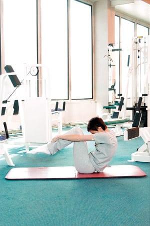 Это упражнение можно считать массажем для спины. Ваша задача — не касаться пола ногами, старайтесь балансировать на копчике.