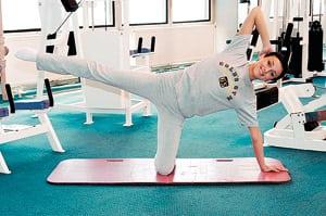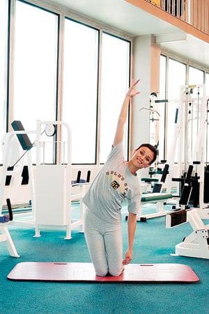 Исходная позиция. Встаньте на колени, корпус прямой, таз слегка вынесен вперед. Чтобы подготовиться к нагрузке, растяните боковые мышцы: опустив левую руку и подняв правую, выполните наклон влево; поменяйте руки и сделайте то же самое в другую сторону. Закончив разминку, наклонитесь влево и обопритесь левой ладонью о пол. При этом левое бедро должно быть точно над коленом. Правую ногу вытяните в сторону параллельно полу. Заведите правую руку за голову, отводя локоть как можно дальше назад. Напрягите мышцы живота и ягодиц. Ваше тело от лодыжки до головы должно образовывать прямую линию.