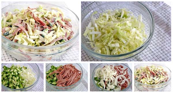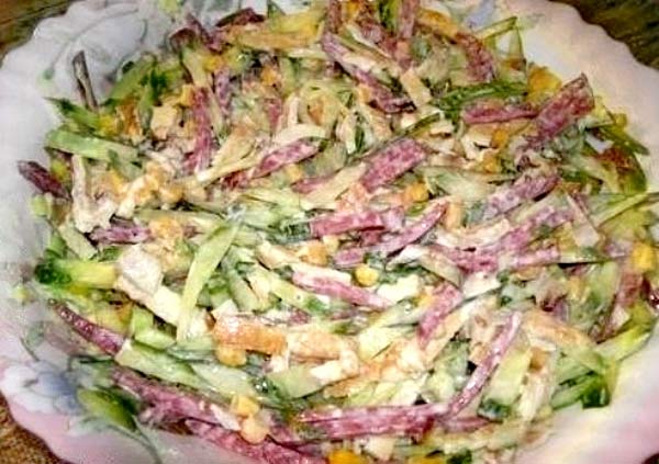 Нарезанный соломкой огурец и колбасу перемешиваем с нашинкованной капустой. Добавляем настроганный лук, майонез, приправляем по вкусу.
