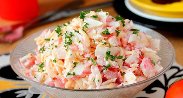Размельчить палочки крабовые и помидор в форме соломки, потереть сыр на терке. Добавить выдавленный чеснок, в конце заправить майонезом.