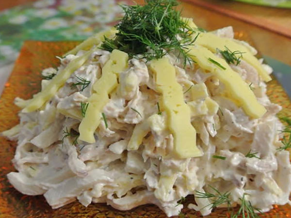 Продукты из расчета 1:1. Отварить, разобрать на волокна куриную грудку, отварить кальмары (3 мин), и вместе с сыром тонко порезать. Продукты перемешать, прибавить специи по вкусу и заправить традиционным майонезом. Готово!