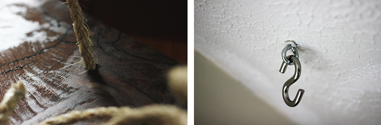 -Повесьте первую петлю на крюк, проверьте длину, если надо, подрегулируйте. Повторите с остальными петлями и узлами, пока тумбочка не будет висеть ровно.