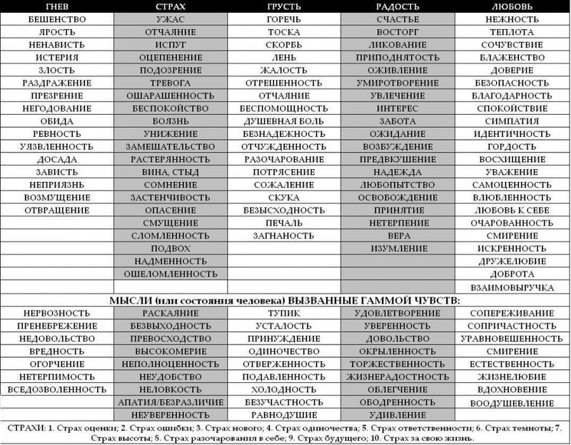 И еще хочу показать вам сборник чувств, эмоций, состояний, которые испытывает человек в течение своей жизни — обобщенная таблица, которая не претендует на научность, но поможет лучше понять себя.Таблица взята с сайта «Сообщества зависимых и созависимых», автор — Михаил.