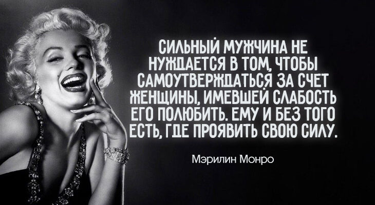 20. «Сильный мужчина не нуждается в том, чтобы самоутверждаться за счет женщины, имевшей слабость его полюбить. Ему и без того есть, где проявить свою силу», – Мэрилин Монро.