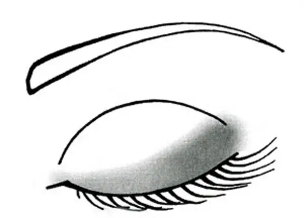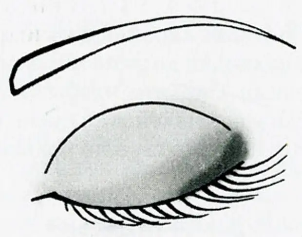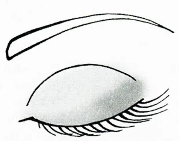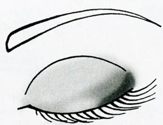 Все верхнее веко, от ресниц до бровей, покрывается светлыми тенями, а подвижное веко окрашивается в более темный тон, причем ближе к внешним уголкам глаз тени накладывают шире и гуще. Нижнее веко подкрашивается вдоль линии роста ресниц тем же темным оттенком.