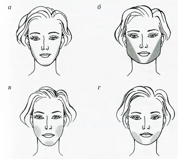 Обладательницам треугольного лица нужно нарумянивать выступающие скулы и краешек подбородка (рис. а). Широкое квадратное лицо можно визуально сузить, если нанести темные румяна на виски и скулы по направлению к уголкам рта (рис. б). Узкое лицо, напротив, расширяют светлыми румянами, нанесенными на щеки и подбородок (рис. в). Круглое лицо корректируют, накладывая румяна ниже скул, по обеим сторонам подбородка (рис. г).