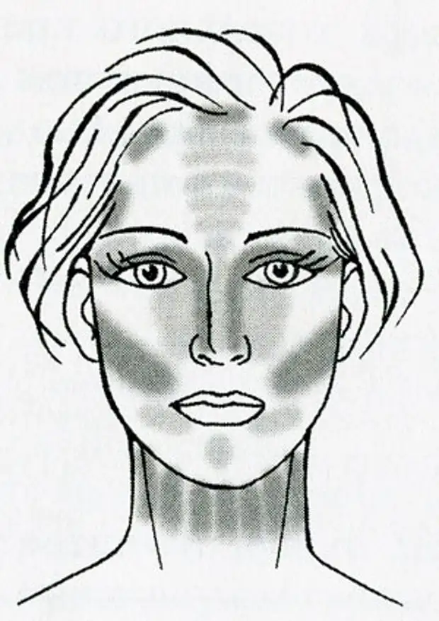 Общий принцип свето-теневой коррекции прост: все, что необходимо скрыть, затемняется, все, что нужно подчеркнуть — осветляется. Это означает, что на излишне массивные, выступающие части лица наносится тональный крем более темного оттенка, а впалые участки, которые требуется «поднять на поверхность», тонируются более светлым кремом (рис.). Границы свето-теневого перехода должны быть плавными и незаметными, поэтому их как следует растушевывают.