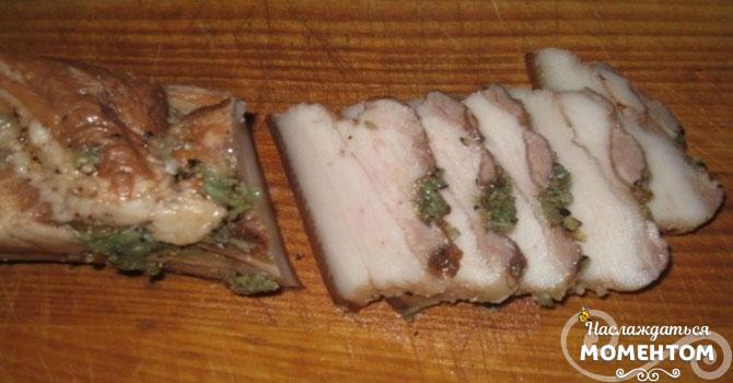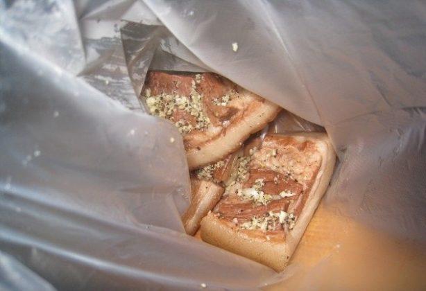 Прошло 30-40 минут. Достаем сало и натираем нашей помазухой.