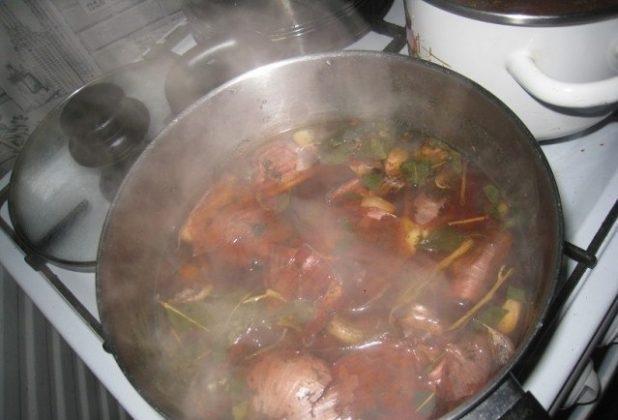 Далее опускаем наши куски в закипевший рассол и оставляем на маленьком огне под крышкой 30-40 мин.