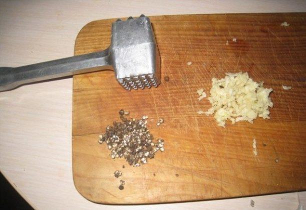 Берем крупную головку чеснока и без жалости давим. Кроме этого, измельчаем перец-горошек в труху.