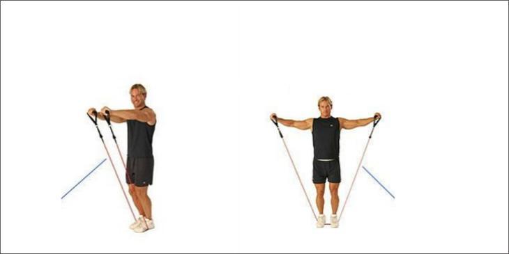 Проработать плечи поможет армейский жим: жгут фиксируется ногами, расставленными на ширину плеч. Попеременно выполняется выпрямление рук вверх (имитируя поднятие штанги). Хороший эффект дает отведение выпрямленных рук вперед и в стороны, тяга к подбородку.