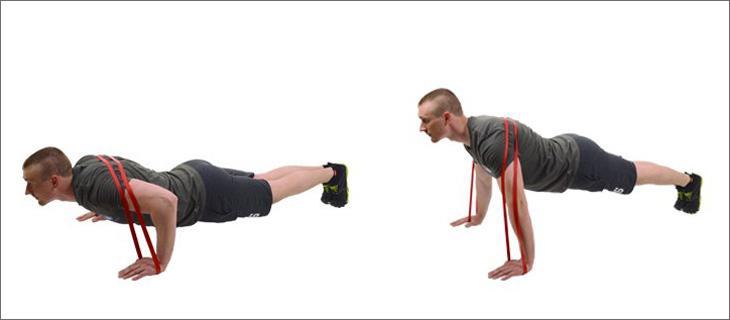 На проработку мышц груди влияют нагрузки в виде отжиманий, усиленных при помощи амортизатора: лента проходит через лопатки и фиксируется руками в упоре лежа.
