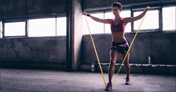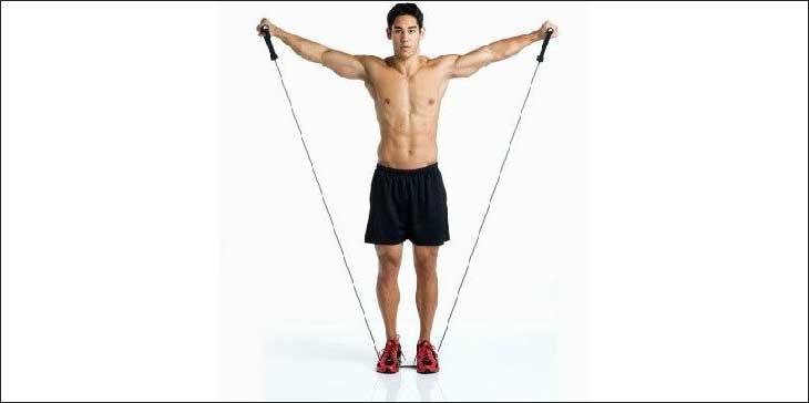 - Отведения рук в стороны. Закрепив эспандер под ногами, выполните отведение рук в стороны, как на фото. 3-4 сетов по 10-15 повторений будет достаточно.