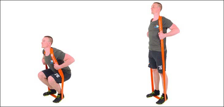 - Приседания с петлями или лентой. Если вы используете петли, то встаньте ногами на одну часть, а другую накиньте на шею. При использовании лент можно свободные концы просто держать в руках в натянутом состоянии. Выполните 3-4 сета по 10-15 повторений.