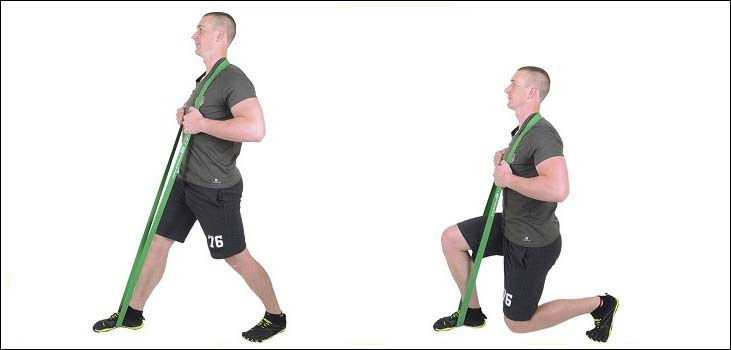 - Выпады. В случае тренинга с эспандером намного удобнее делать сначала один подход на одну ногу затем на другую. Эспандер при этом следует зажать под стопой впереди стоящей ноги. Выполните 3-4 сета по 10-12 повторений на каждую ногу.