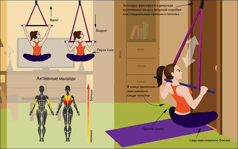 - Вертикальная тяга. Аналог вертикальной тяги к груди в блоке. Упражнение нагружает широчайшие мышцы спины. Закрепите середину эспандера сверху, желательно на потолке. Встаньте или сядьте снизу и возьмите свободные концы в руки. В исходном положении руки должны быть подняты вверх, а эспандер натянут. Потяните руки вниз за счет сокращения широчайших. Выполните 3-4 сета по 10-12 повторений.