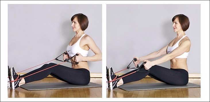 - Тяга к поясу сидя. Закрепите середину эспандера за стопы. Мощным движением потяните рукоятки к животу, при этом сводя лопатки. Выполните 3-4 сета по 10-12 повторений.