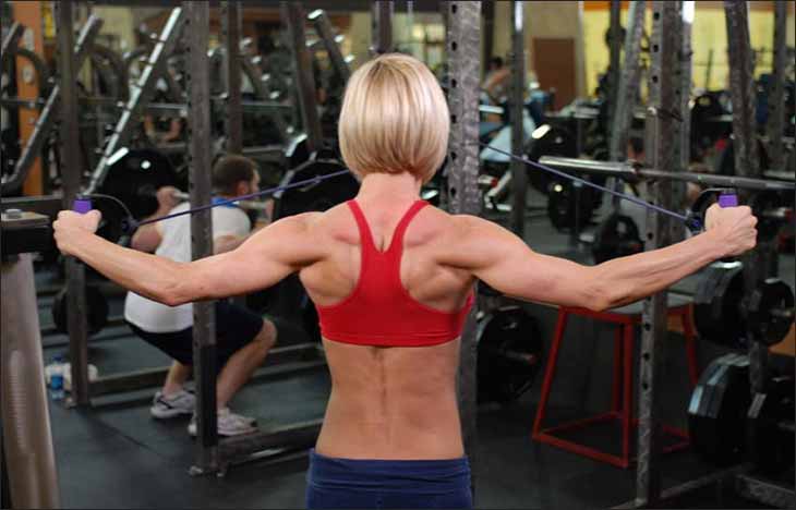 - Разведения рук назад. Упражнение задействует трапециевидные мышцы. Но и плечевой пояс получает порцию нагрузки. Так что этим упражнением вы прокачаете еще и задние дельты. Выполните 3-4 сета по 10-12 повторений.