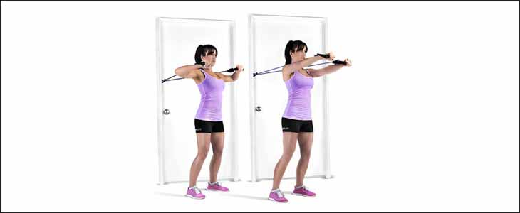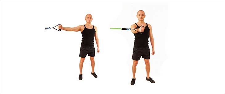 - Сведение одной руки. Закрепив эспандер на уровне лопаток, возьмите свободный конец в выпрямленную руку. Встаньте боком к месту крепления. Плавным движением, преодолевая силу упругости эспандера, приведите руку в положение перед собой. Выполните 3-4 сета по 10-12 повторений на каждую руку.
