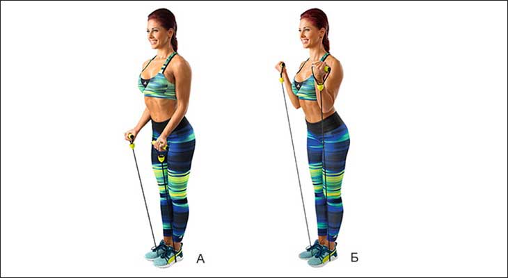 - Сгибания на бицепс стоя. Закрепите эспандер, прижав его ногами к полу. Свободные концы возьмите в руки. Выполните сгибания. Хват можно менять на пронированный (ладони вниз) или нейтральный (ладони навстречу друг другу). Сделайте 3-4 сета по 10-12 повторений.