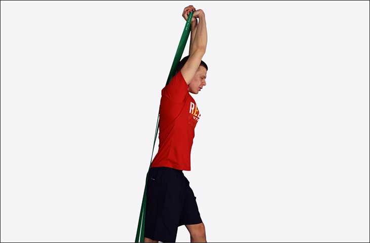 - Разгибания на трицепс стоя. Крепление эспандера то же. Руки от локтя до плеча направлены вверх и прижаты к ушам. Плавным движением выполните разгибание обеих рук. Сделайте 3-4 сета по 10-12 повторений.