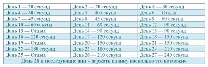 Планка должна быть завершена через четыре недели. Сначала вы просто держите планку в течение 20 секунд. Легко, правда? Медленно, вы повышаете свою выносливость, пока не достигаете четырех минут в течение последних дней. Следуйте этому плану: