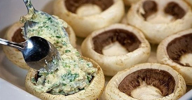 Промойте и обсушите шампиньоны, острым ножом подрежьте и выньте ножки.