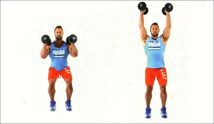 - Швунг жимовой с гантелями – 3-4 подхода по 6-8 повторений.