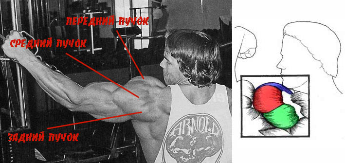 Основная функция дельтоидов — поднятие рук в стороны выше уровня плеч. И здесь главную роль играет боковая головка дельтовидной мышцы — именно она способствует поднятию и опусканию рук в стороны. Передняя же головка помогает поднимать руку вперед и вверх, а задняя, как Вы могли догадаться, участвует в отведении руки назад и вверх.