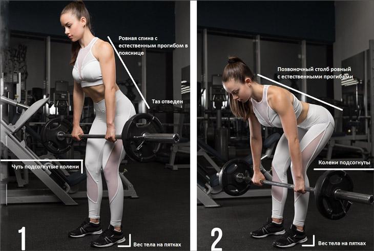 Правильной технике становой соответствуют чуть согнутые в коленях ноги и прямая спина. Которая должна оставаться таковой на протяжении всего упражнения. Причем вы должны стремиться не наклониться вперед, а отвести назад пятую точку. Как будто хотите упереться ягодицами в воображаемую стенку позади вас. Руки с отягощением при этом должны быть направлены вертикально вниз. Опускаться следует до ощущения легкого натяжения задней поверхности бедра.