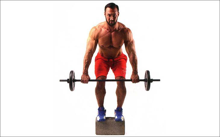 Выполняется только за счет мышц ног. Подставка используется для увеличения глубины приседа. Присядьте вниз настолько насколько позволяет гибкость. Затем встаньте только с помощью разгибания ног и доведите штангу до уровня колен. Затем вернитесь в исходное положение.