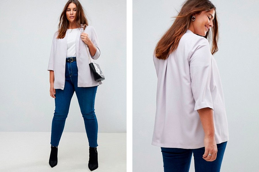 Классическое базовое сочетание для размеров plus size — удлиненный жакет, брюки-трубы длины 7/8 и стильный топ.