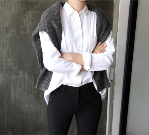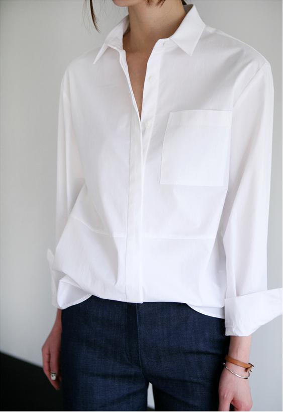 Рубашка из хлопка или смеси хлопка с эластаном с классическим прямым воротничком (вариация — рубашка-боди). Посадка по фигуре достигается либо за счет вытачек, либо за счет изгиба бокового кроя и растяжения ткани. Классическое сочетание: с синими джинсами, блейзером и балетками. Подходит всем, кроме женщин с очень большим бюстом.