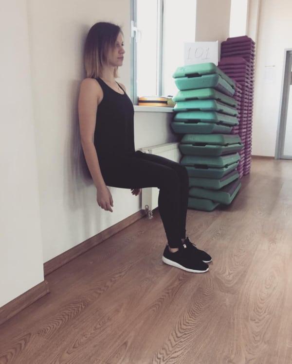 Встаньте спиной вплотную к стене, согните колени на 90 градусов, словно хотите сесть на стул. Держите лопатки плотно прижатыми к стене, руки вытяните вдоль туловища. Задержитесь в таком положении на минуту. Постепенно увеличивайте время в «стульчике».