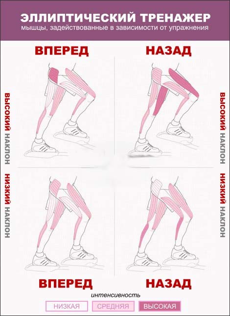 Кроме скорости движения на эллипсоиде вы можете менять сопротивление, что увеличит нагрузку на рабочие мышцы. Предусмотренная возможность менять наклон педалей позволит перераспределять нагрузку между мускулами и сильнее нагружать те или иные участки бедер и ягодиц. И не забывайте о возможности обратного хода. То есть движения назад, о преимуществах которого я говорил выше.