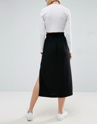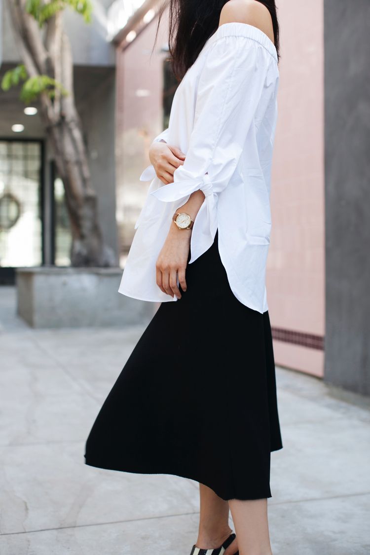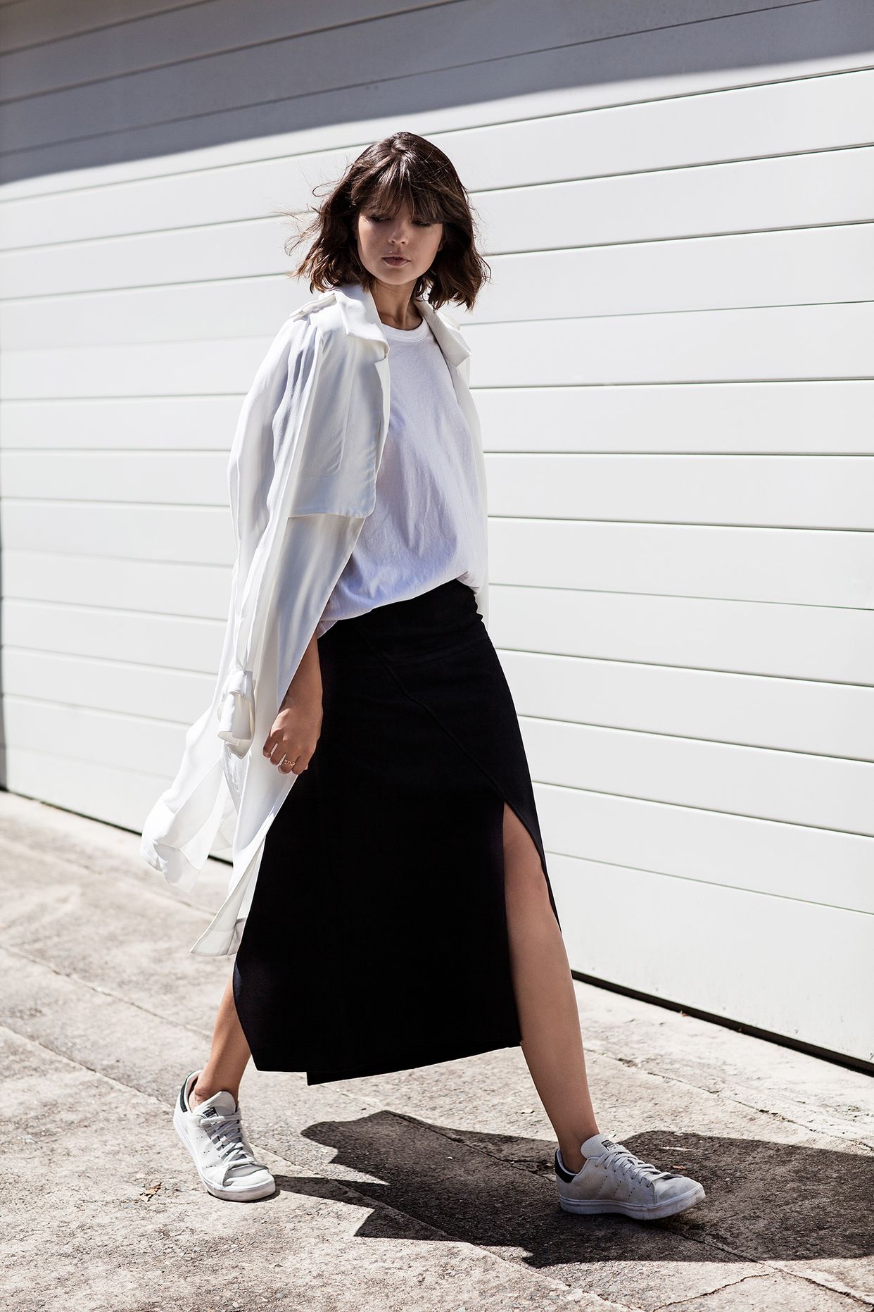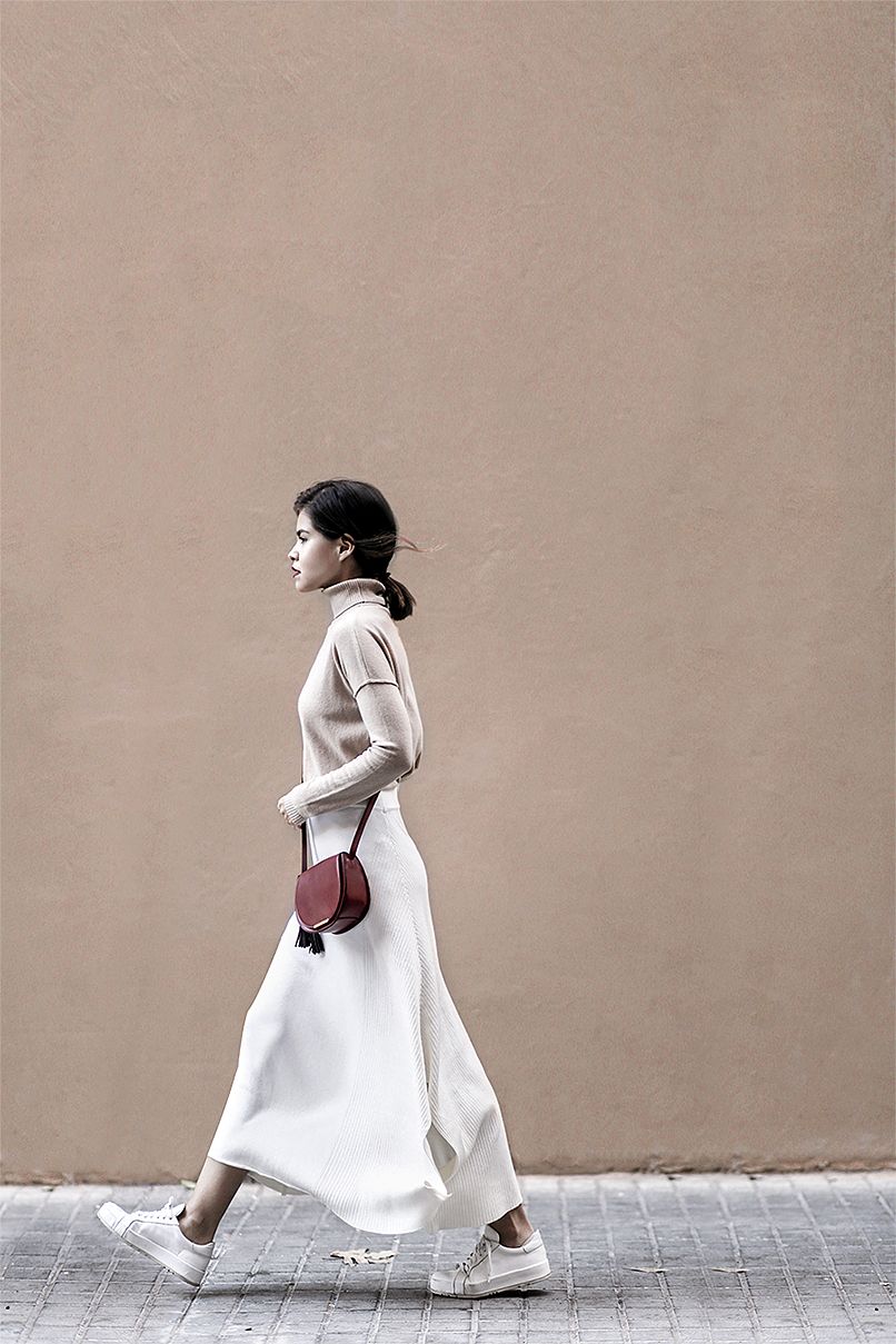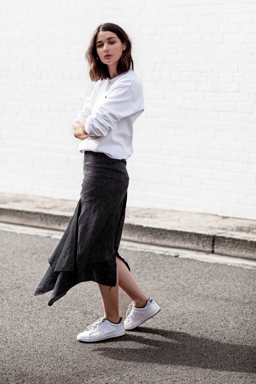 Учитывая то, что миди-длина привлекает внимание к зоне щиколоток, такие юбки идеально работают в паре со statement обувью, делая акцент на нижнюю зону. Впрочем, и с обычными кедами юбки-миди работают тоже (объемная обувь и длина юбки подчеркивают хрупкость щиколоток).