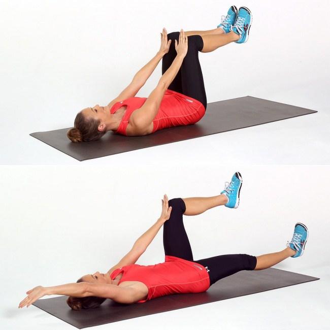 Лягте на спину, вытянув руки над головой. Медленно поднимайте согнутое колено и дотрагивайтесь до него рукой, как на фото. Левая нога — левая рука, правая нога — правая рука, — это главное правило. Возвращайтесь в начальное положение и повторите.
