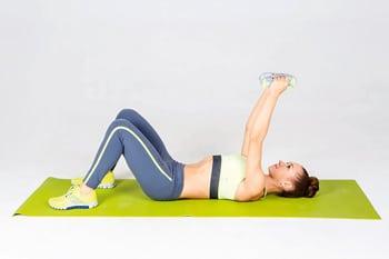 Лягте на спину, согните ноги в коленях. Возьмите гантели и поднимите руки вверх, наклонив их от вертикали на 15–20° в сторону головы (А). Согните руки в локтях, пытаясь коснуться гантелями пола (Б). Вернитесь в исходное положение. Сделайте 20–25 повторов.
