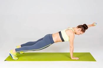 Встаньте в позу планки с опорой на правую руку, в левую возьмите гантель весом 2–4 кг, ноги — на ширине плеч. Отведите прямую левую руку вперед (как на фото). Вернитесь в исходное положение. Сделайте 13 повторов. Поменяйте руку, перехватив гантель. Не думайте, что превратитесь в обладательницу широких плеч, регулярно выполняя эти упражнения: заметное наращивание мышечной массы невозможно по гормональным причинам, зато красивый рельеф своих рук вы оцените очень скоро.