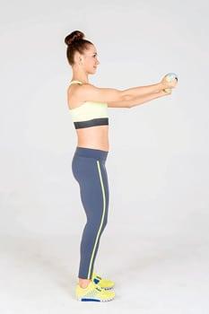 Встаньте прямо, ноги — на ширине плеч, руки держите вдоль тела (ладонями вперед). Поднимите прямые руки до уровня подбородка (как на фото). Затем вернитесь в исходное положение. Сделайте 20–25 повторов.