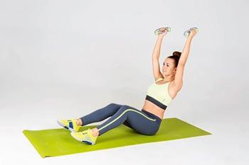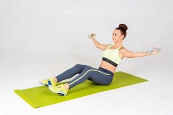 Сядьте на коврик, согнув ноги в коленях. Возьмите гантели весом 2–4 кг и вытяните руки над головой, отклоните назад корпус (А). Разведите руки в стороны (ладонями вверх) до параллели с полом (Б), затем вернитесь в исходное положение. Сделайте 12–15 повторов.