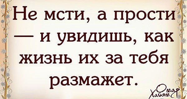 Не мстите людям.. Никогда! Им жизнь подаст сюрприз на блюде. У тех, кто предал, будет так — Что заслужили, то и будет! У вас все будет Хорошо. Отбросьте злость, забудьте ссоры. Их поезд в принципе ушел, у вас билет на новый скорый. В вагон входите — в добрый путь. Они и так свое получат. Им ни за что вас не вернуть. А им судьба представит случай, чтоб в нужный день и в нужный час … Они раскаялись в измене. Вверху решают все за Нас — Всем по поступкам и по… Вере!