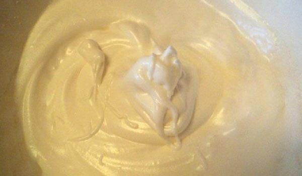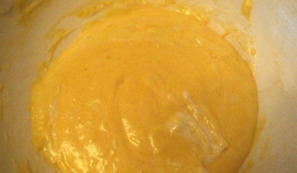 3. Добавляем к белкам разрыхлитель и муку (неполный стакан). Аккуратно перемешиваем нашу смесь. В конце вливаем растопленное сливочное масло. Готовое тесто нужно разделить на 4 части.