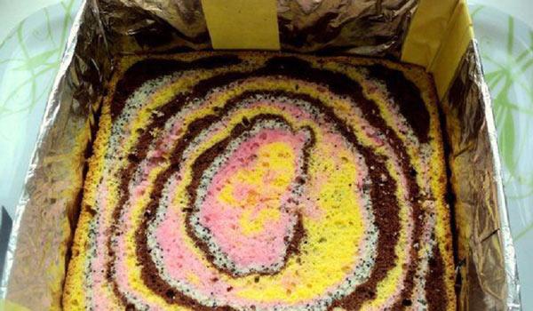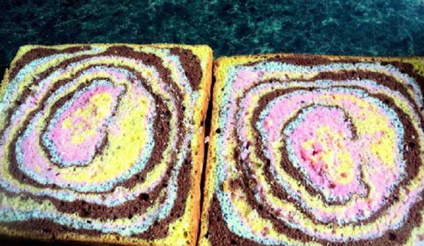 9. Разогреваем духовку до 180 °С и отправляем наш разноцветный пирог выпекаться. Через 45 минут наш бисквит будет готов. Охлаждаем готовый корж и разрезаем на 2 части.